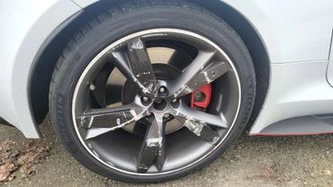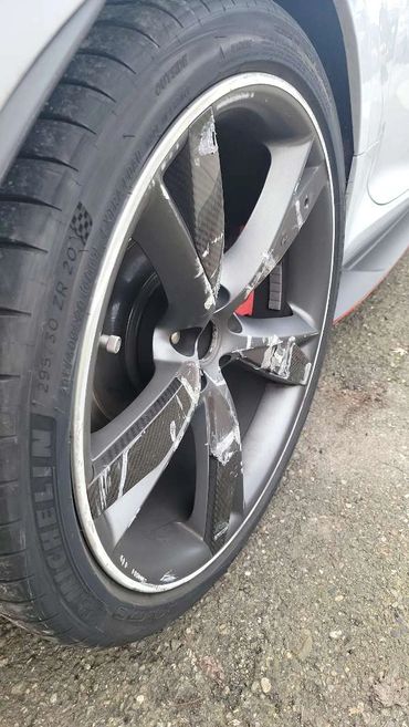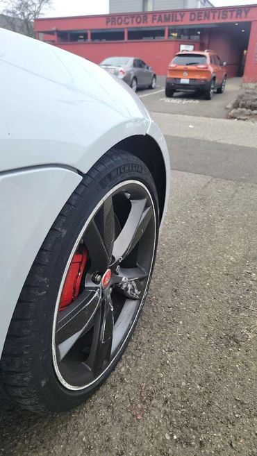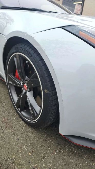 The damage to this car was on the passenger side, from front to back. We had a mix of new parts and body work and the results are just as gorgeous as it was before the accident. See the images below for closeups of the damage.