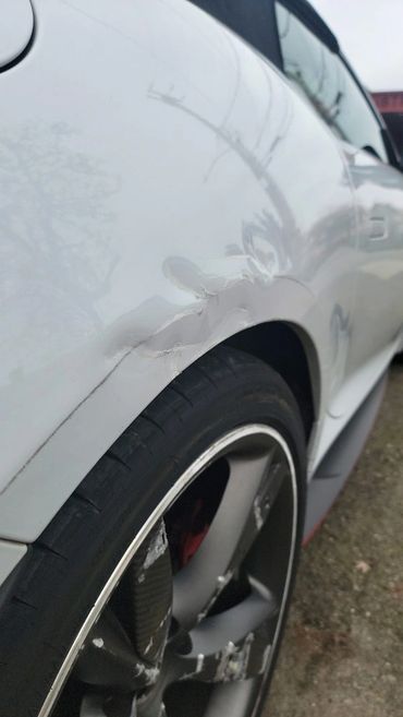 So, white cars are great, they show less dirt, they are not as hot on a summer day… but, it is super hard to photograph damage. So, bare with us a little on the before photos. :-)